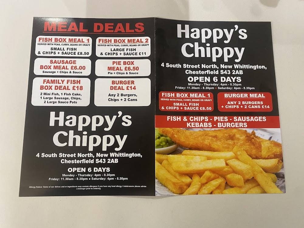 Happy's Chippy is cozy and inviting, nestled at 4 South Street North in New Whittington, Chesterfield, S43 2AB. The eatery radiates a friendly vibe, perfect for families or anyone looking to savor a classic British meal. It's just a stone's throw away from residential areas, making it a convenient stop for locals or visitors to the region. With a casual dining setup and an emphasis on customer service, diners can expect friendly faces ready to serve delicious meals. The place is open daily, which means there's always an opportunity to fulfill that fish and chip craving. Street parking is available free of charge, ensuring easy access for pickup or dine-in. During peak hours, especially on Fridays, it rumbles with energy as families and friends gather for their favorite chippy treats. Reservations are accepted, which prioritizes customer convenience in this busy takeout spot.